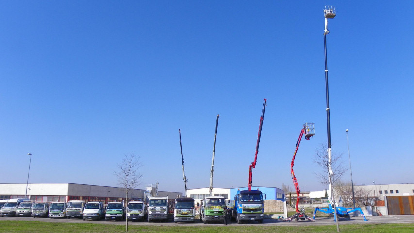 » Piattaforma aerea mobile semovente fino a 23 m con gabbia,a scoppio ed elettrica; » Piattaforma aerea mobile semovente fino a 14,50 m con gabbia, a scoppio ed elettrica; » Autocarri ribaltabili con portata fino a 3,50 tonnellate; » Autocarro con gru portata a pieno carico 7,5 tonnellate; gru portata 0,8 tonnellate; » Autocarro con gru tre assi, ribaltabile trilaterale, portata fino a 26 tonnellate a pieno carico; gru portata 3,7 tonnellate; » Furgoni chiusi; » Terna; » Trattori tosaerba da 35, 20 e 16 hp; » Macchine tosaerba a piatto frontale; » Escavatori da 30 e 16 quintali; » Minipala 20 quintali; » Pacher;